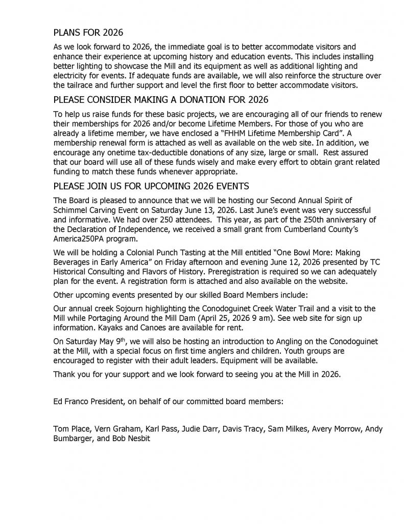 Annual Creek Sojourn 2026 , Saturday April 25. A 10 mile paddle in canoes and kayaks on the Conodoguinet Creek Water Trail. Boats are available for rent. The put in is the bridge on Graham’s Woods Road about a mile upstream from the Mill. After portaging around the mill and visiting the Mill’s interior, paddlers will complete the sojourn in 3 hours to N. Middleton Park takeout. See the Sojourn section below for more information and registration forms.