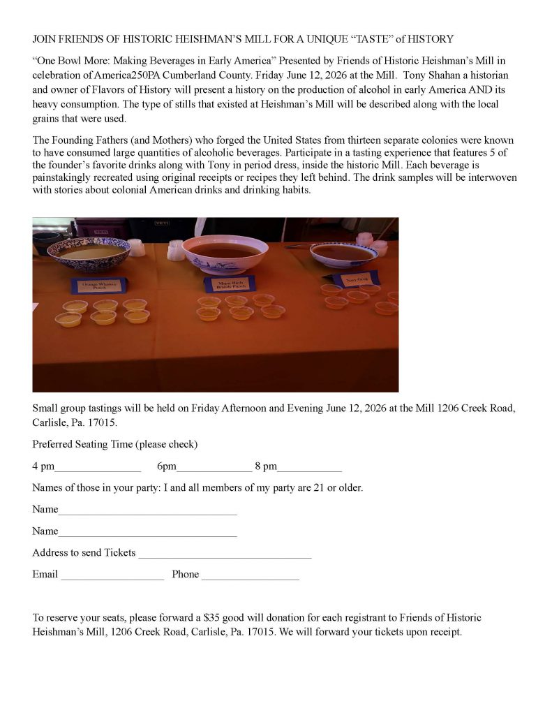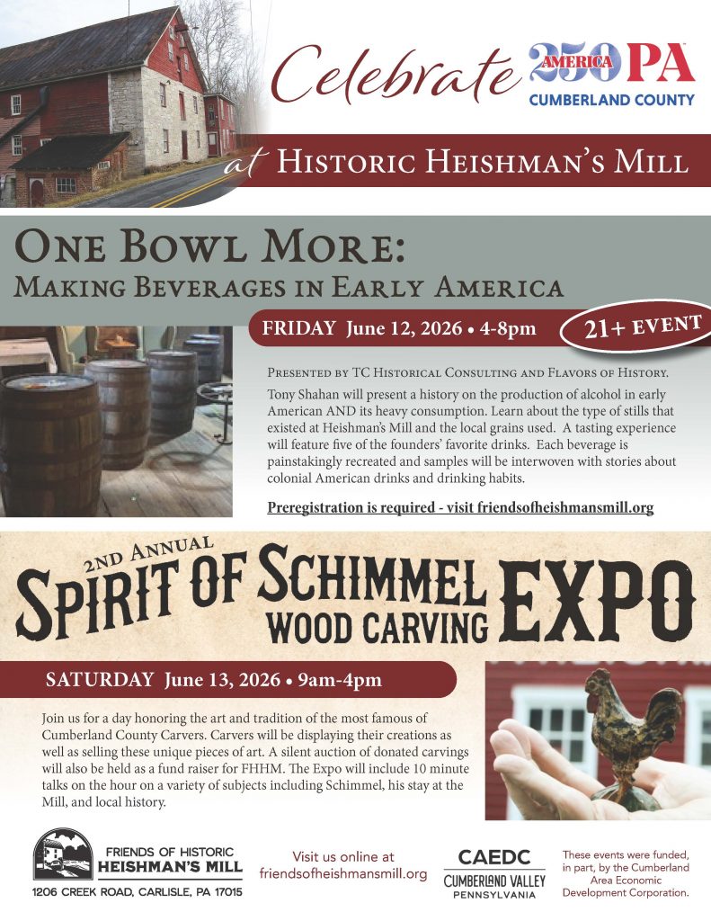 Friends of Historic Heishman’s Mill proudly celebrates the 250th Anniversary of the signing of the Declaration of Independence in Philadelphia. This official, America250PA event is funded in part by the Cumberland Area Economic Development Corporation. Please plan to join us for these two unique events at Historic Heishman’s Mill.