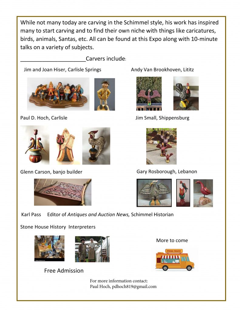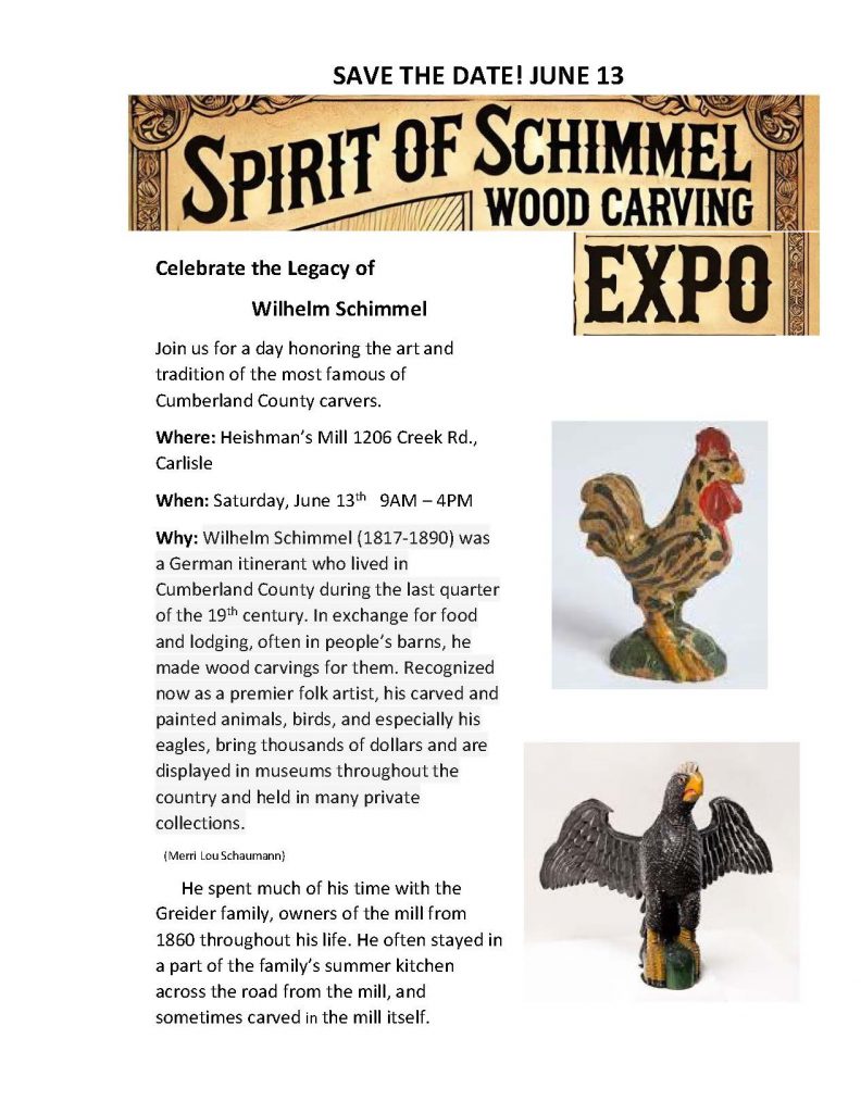 A silent auction of donated carvings will also be held as a fund raiser for FHHM. The Expo will include 10 minute talks on the hour on a variety of subjects including Schimmel, his stay at the Mill, and local history throughout the day. We are pleased to partner with the Cumberland County Historical Society who will host an information table with descriptions of their collection of Schimmel and other local carvers.