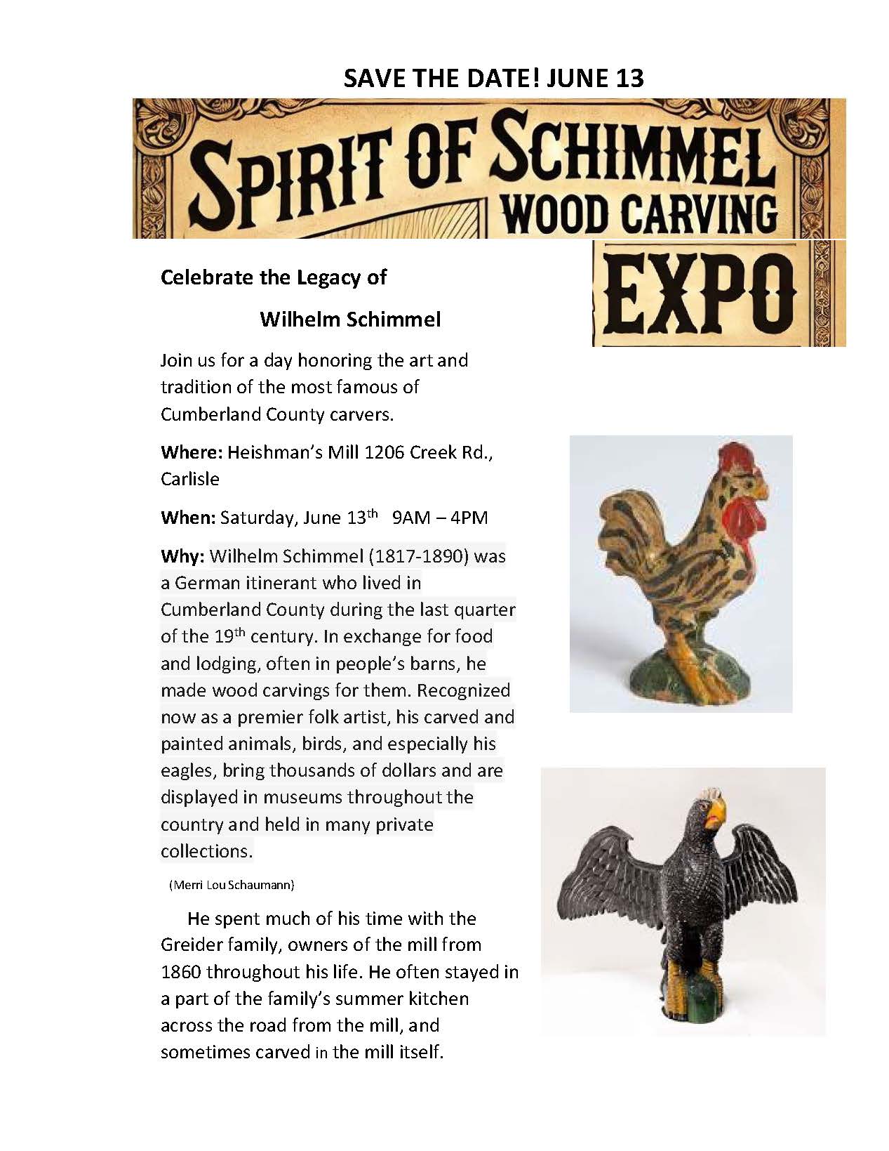 A silent auction of donated carvings will also be held as a fund raiser for FHHM. The Expo will include 10 minute talks on the hour on a variety of subjects including Schimmel, his stay at the Mill, and local history throughout the day. We are pleased to partner with the Cumberland County Historical Society who will host an information table with descriptions of their collection of Schimmel and other local carvers.